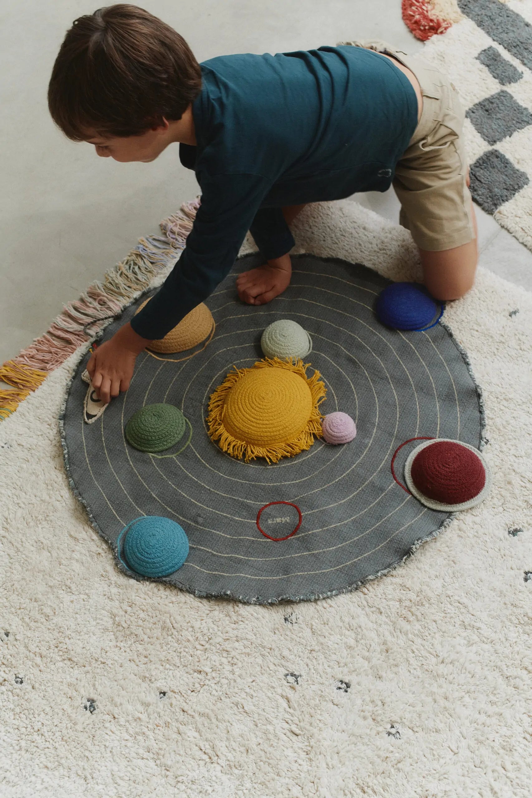 This dark grey round canvas is printed with thin stripes simulating planet orbits and includes handcrafted braided cotton cord planets to place in their correct positions, along with a small rocket.