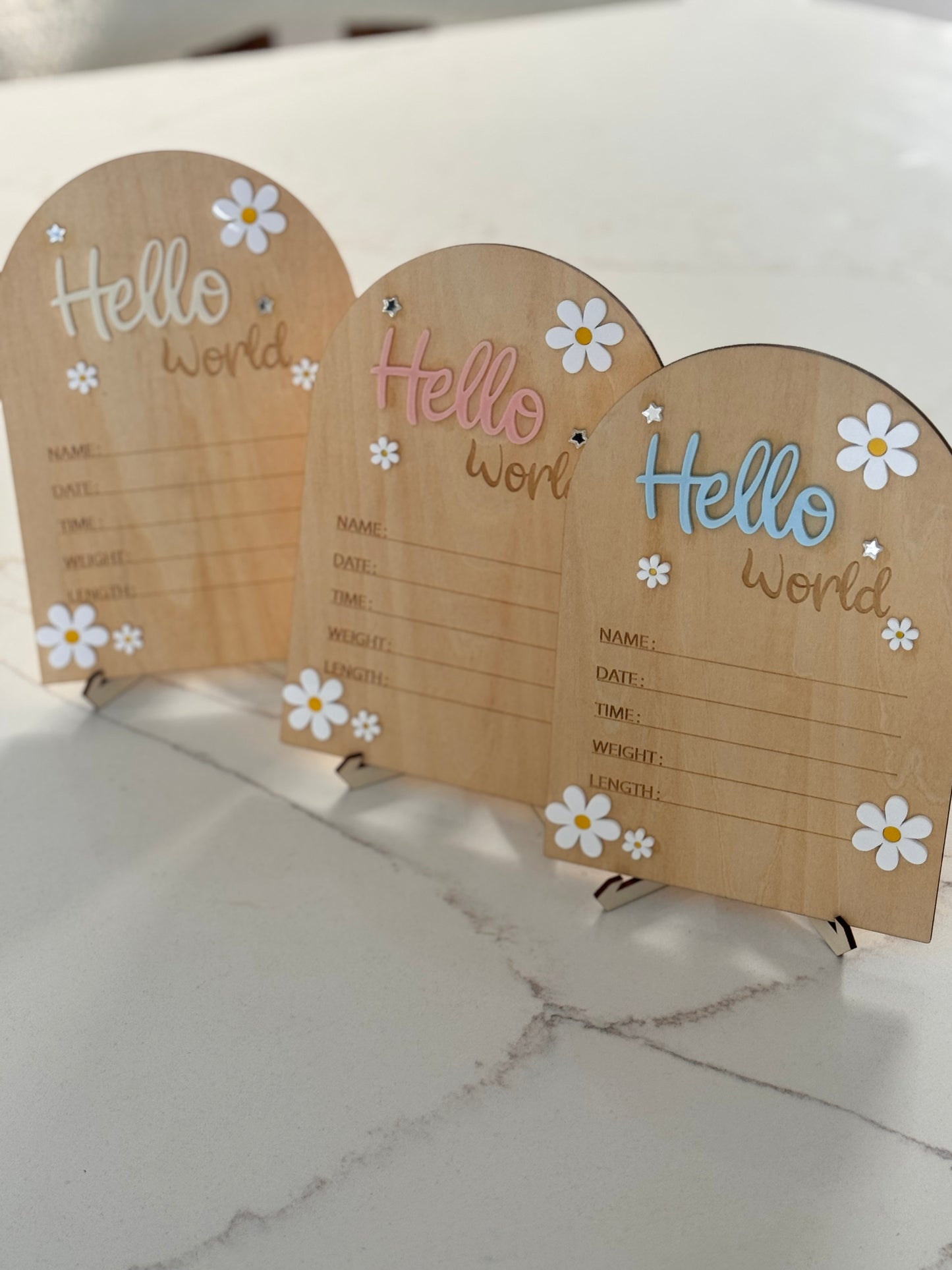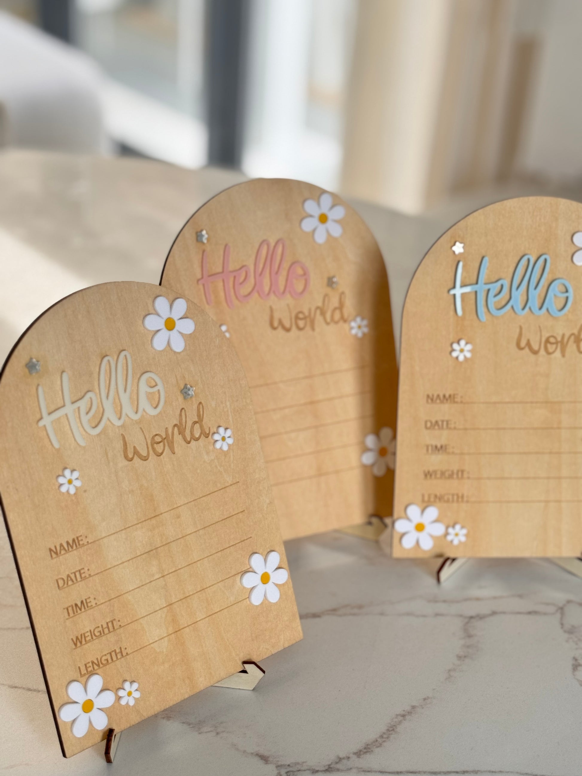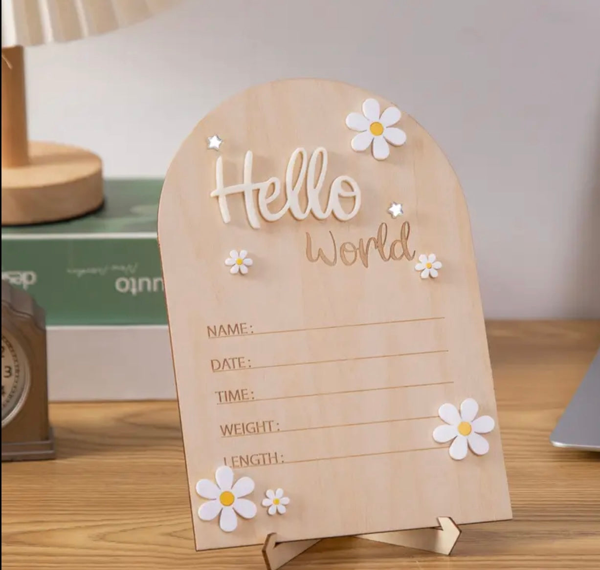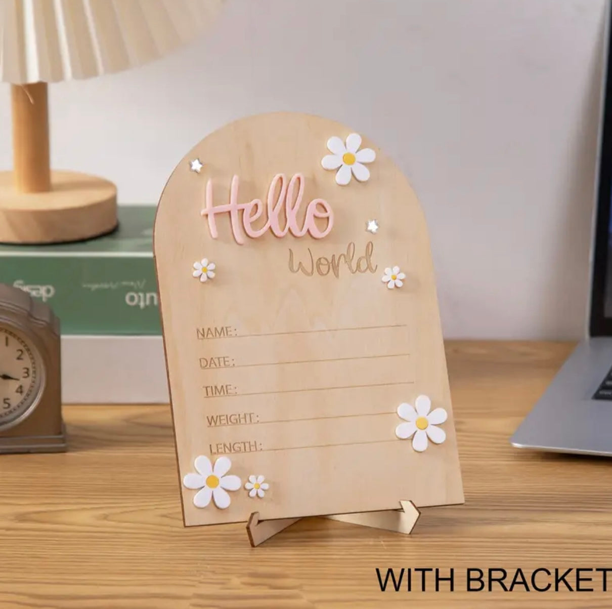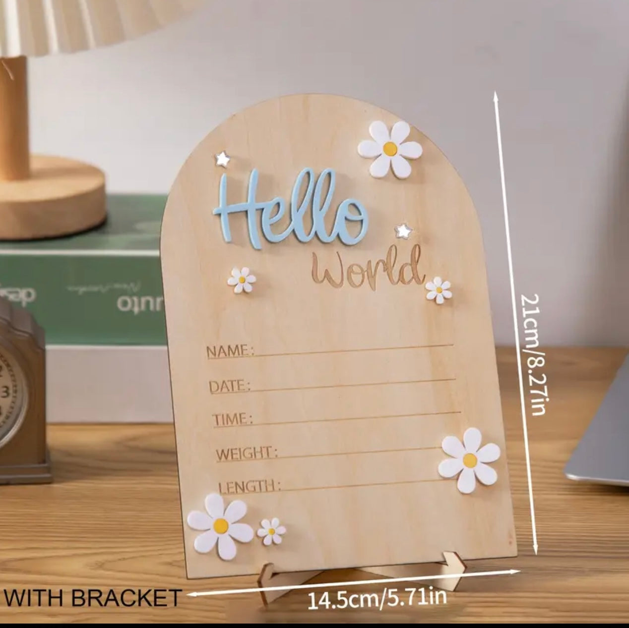 Celebrate your newborn’s arrival with our handcrafted “Hello World” wooden birth announcement plaques. Made from high-quality wood and adorned with delicate floral details, this personalized sign includes space to record your baby’s name, birth date, time, weight, and length. A timeless keepsake for baby photos, hospital reveals, and nursery décor, this plaque is perfect for announcing your little one’s arrival in style. Available in pink, blue, or neutral tones—ideal for baby girls, boys, or gender-neutral gifts.