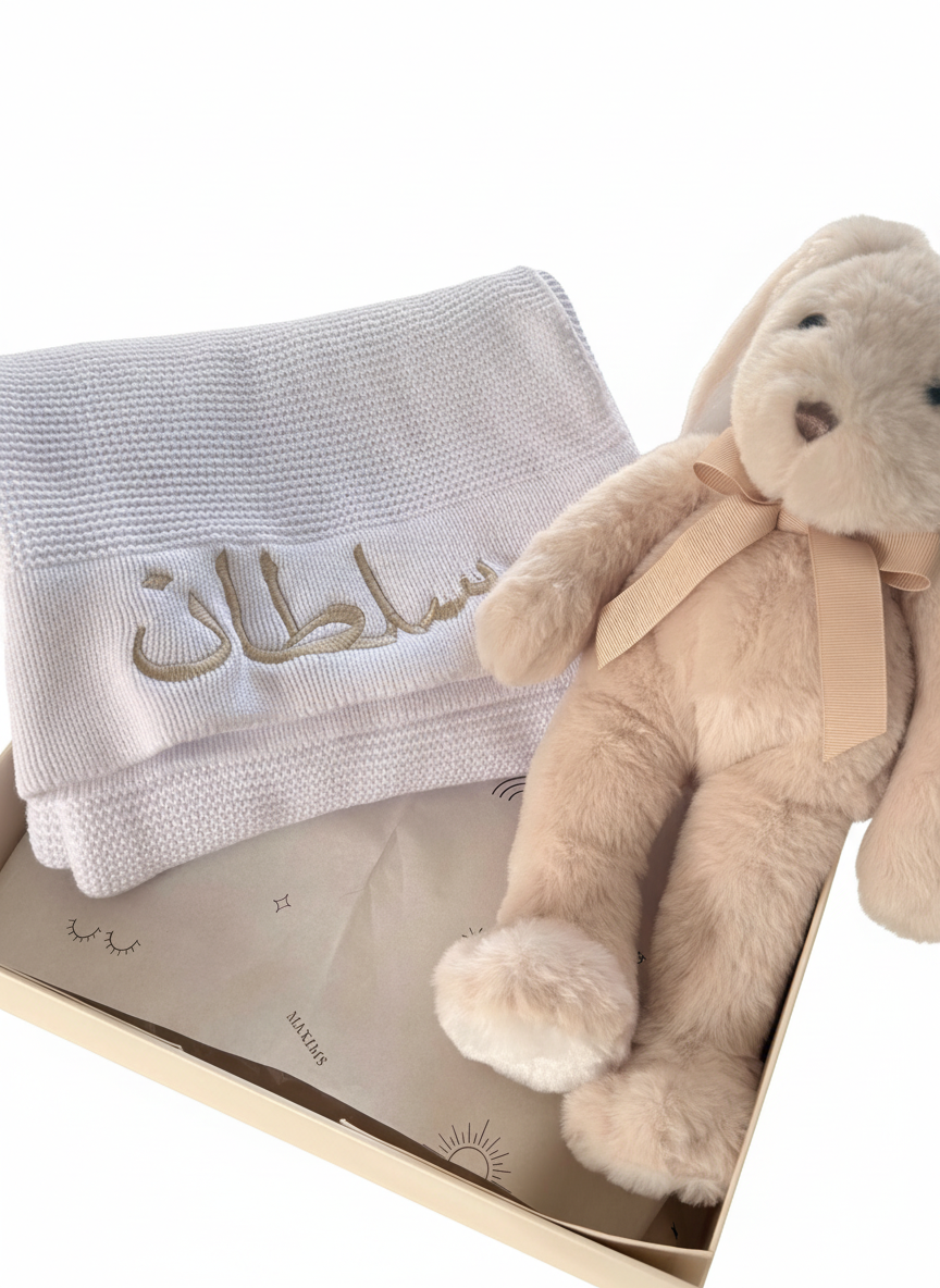 Personalised Baby Blanket & Soft Toy Gift Set – English or Arabic Embroidery