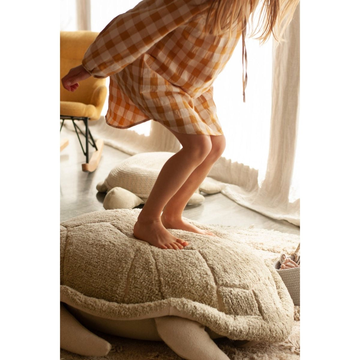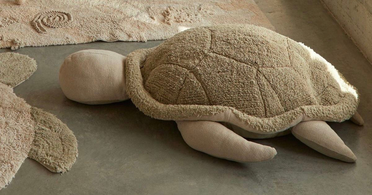 Say hello to Mrs. Turtle! With a shell of olive green soft cotton pile tufted in a symmetric pattern, this pouf is perfect for your little ones to climb up upon. With paws, head and tail in natural color canvas and an olive green canvas belly, the pouf cover is washable: just remove the inside filler by using the zipper at the bottom. The main part of the pouf is filled with polystyrene pearls to make a perfect seat for your kids, and the head and paws are filled with soft polyfill.