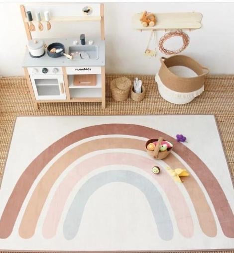 Eco-Friendly Nordic Style Rainbow Patterned Mat, a perfect addition to styling a nursery or the play area of your little human. It is a custom polyester fabric, feels very comfortable, non-slip design on the back. It is practical in the baby room, can be used as a game mat, crawling mat, play rug, carpet, multifunctional usage.