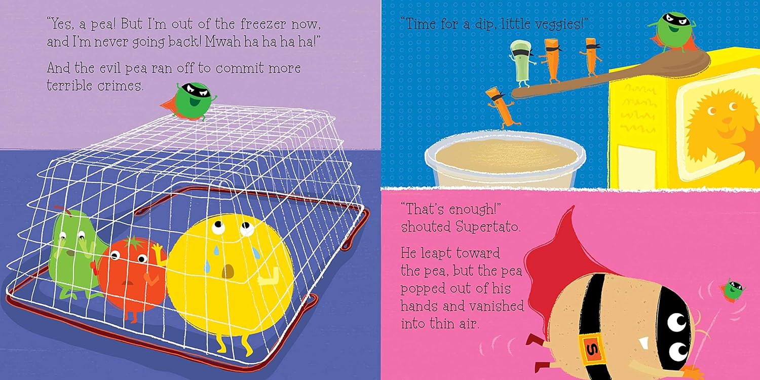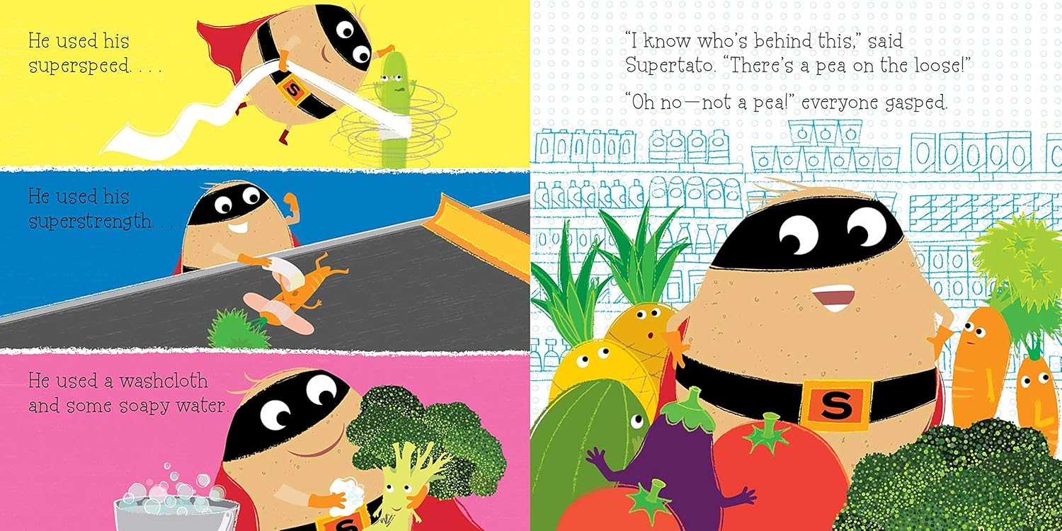 A spud fulfills his destiny as a supermarket superhero in this delightfully wacky picture book from the creators of Norman the Slug with a Silly Shell! Meet Supertato! He’s the supermarket superhero with eyes everywhere—always on the lookout for danger. When the veggie aisle is thrown into turmoil by an evil pea, Supertato heroically springs into action! But this very, very evil pea won’t go back to the frozen section without a fight. Will justice prevail, or has Supertato finally met his match?