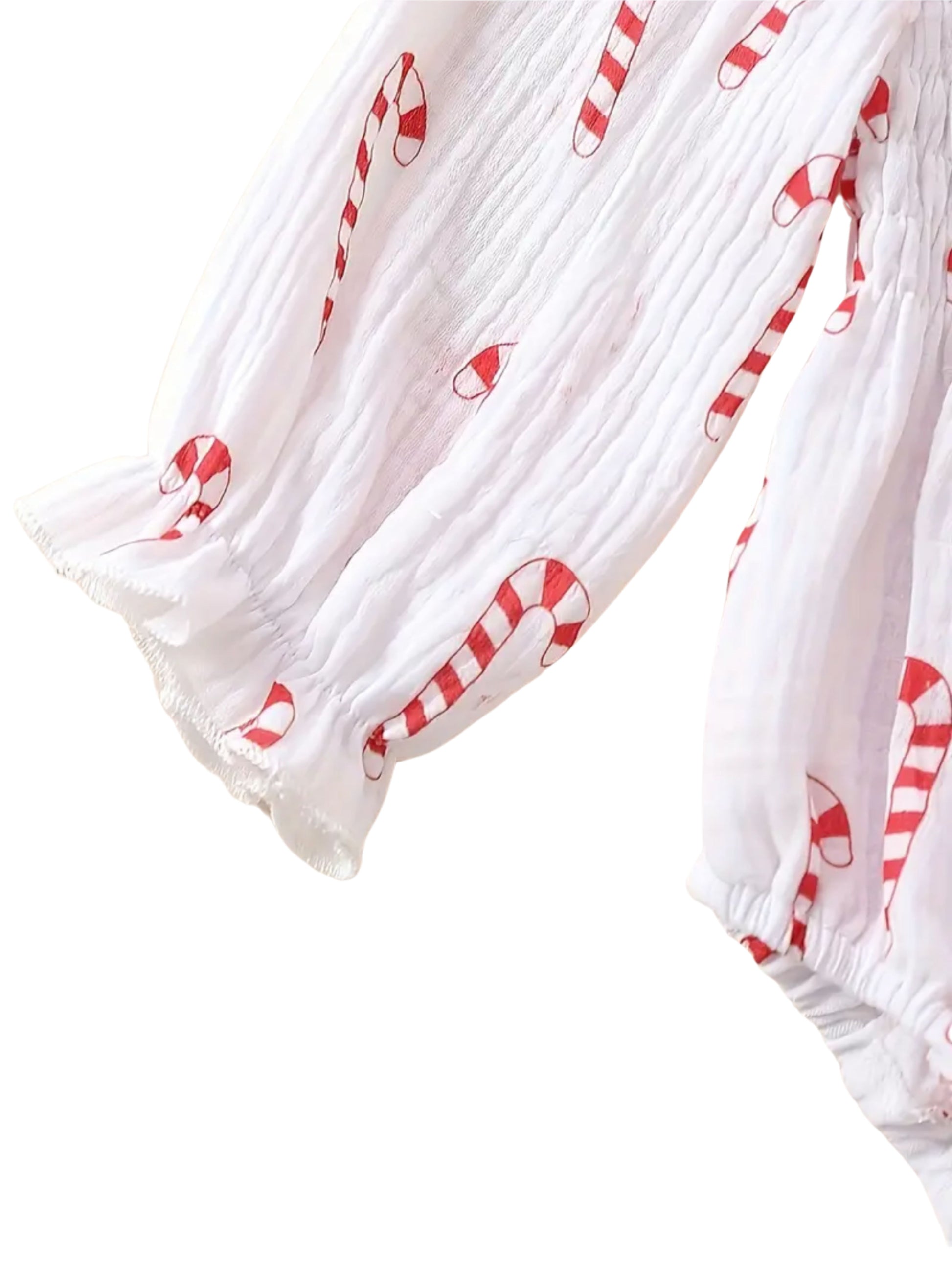 Bring festive cheer to your little one’s holiday moments with our Candy Cane Christmas Romper. Made from soft, breathable cotton muslin, this off-shoulder romper features a playful red candy cane print and gentle smocking for a comfortable, stretchy fit. The matching bow headband completes the sweet seasonal look — perfect for photos, playdates, or Christmas morning.