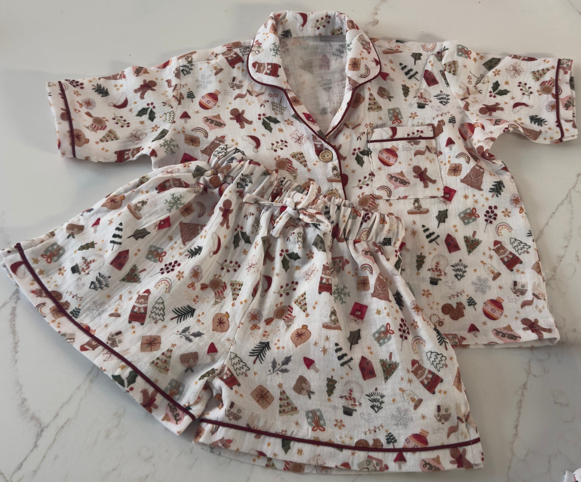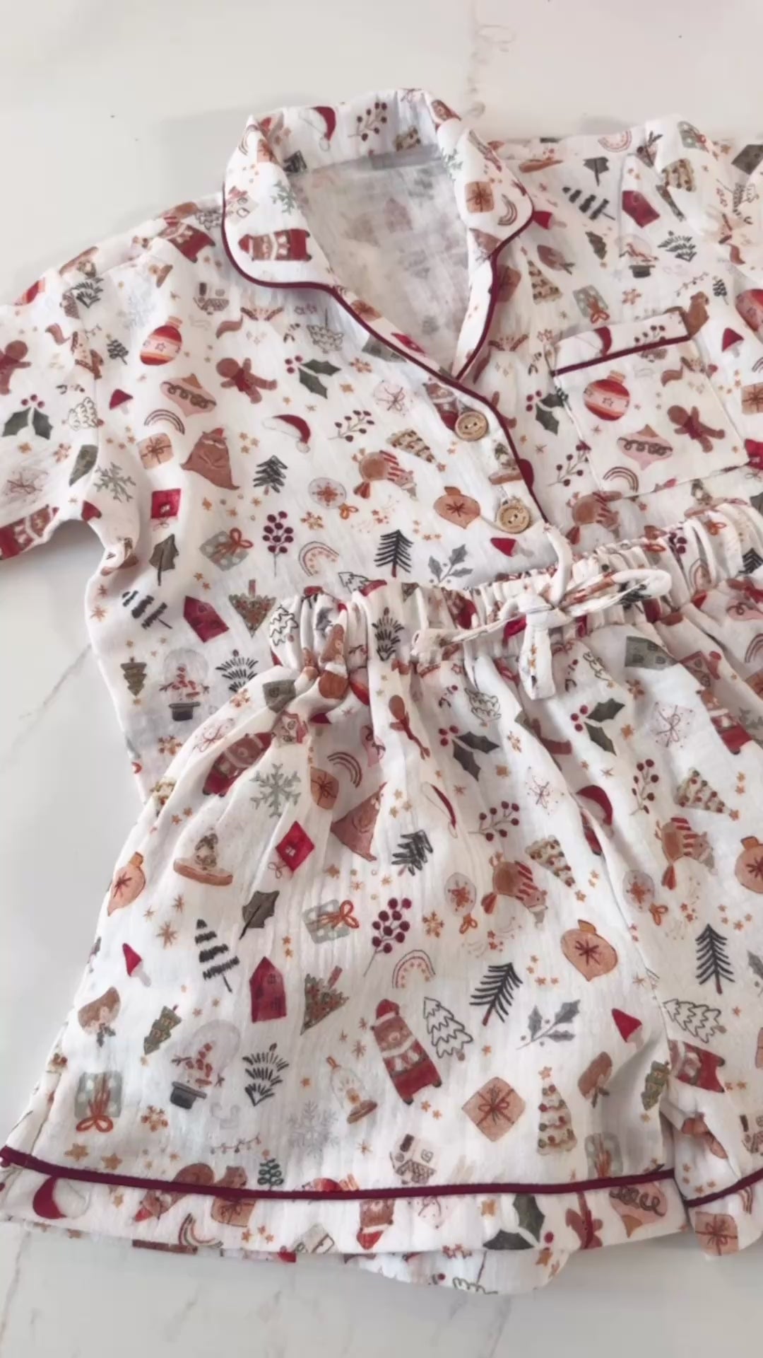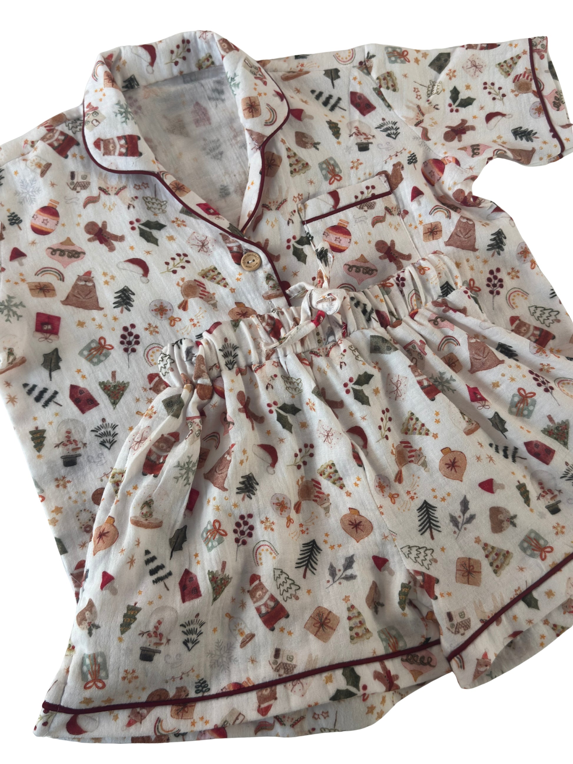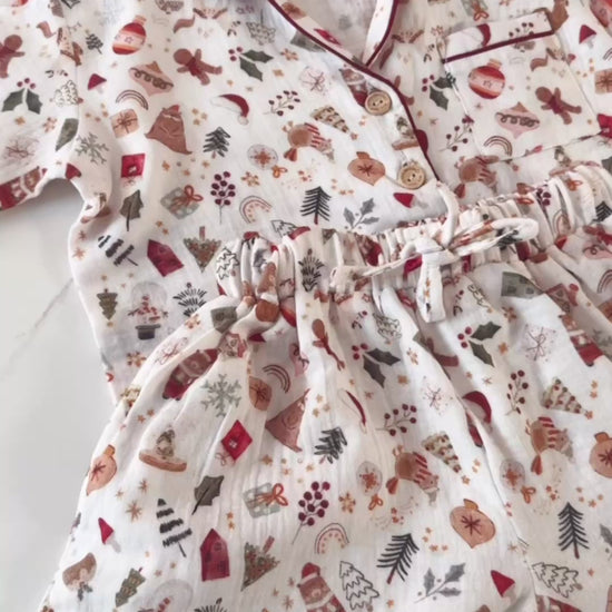 Embrace the warmth of the festive season in our Merry Moments Pyjama Set. Adorned with playful Christmas icons — from gingerbread men to candy canes and gifts — this soft cotton muslin set is designed for cozy comfort and joyful lounging. Featuring a classic button-up top with contrast piping and relaxed-fit shorts, it’s perfect for holiday mornings, matching family sets, or festive gifting.