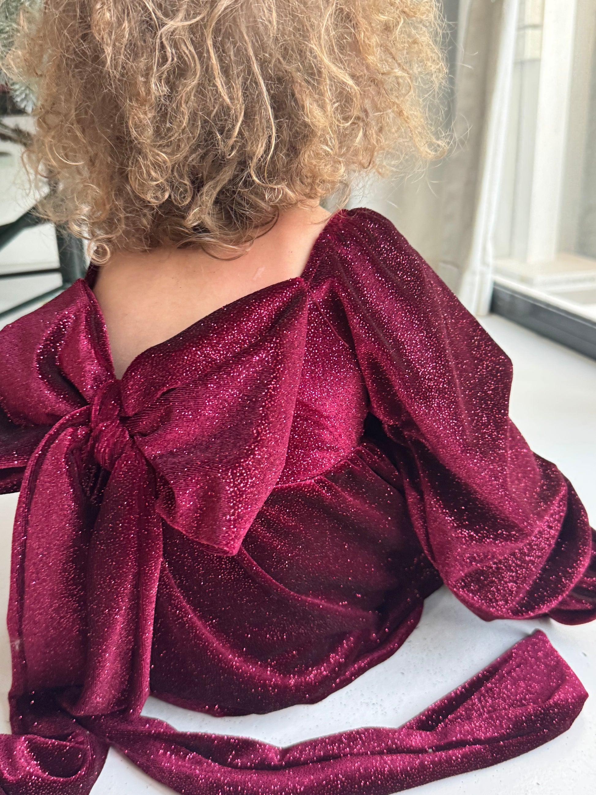 Let your little one shine in our Sparkly Big Bow Party Dress, designed in a rich burgundy velvet with a magical shimmer that catches every light. This show-stopping piece features dramatic puff sleeves and an oversized statement bow at the back for the ultimate festive look. Soft, stretchy, and comfortable, it’s perfect for Christmas photos, parties, and every special occasion.