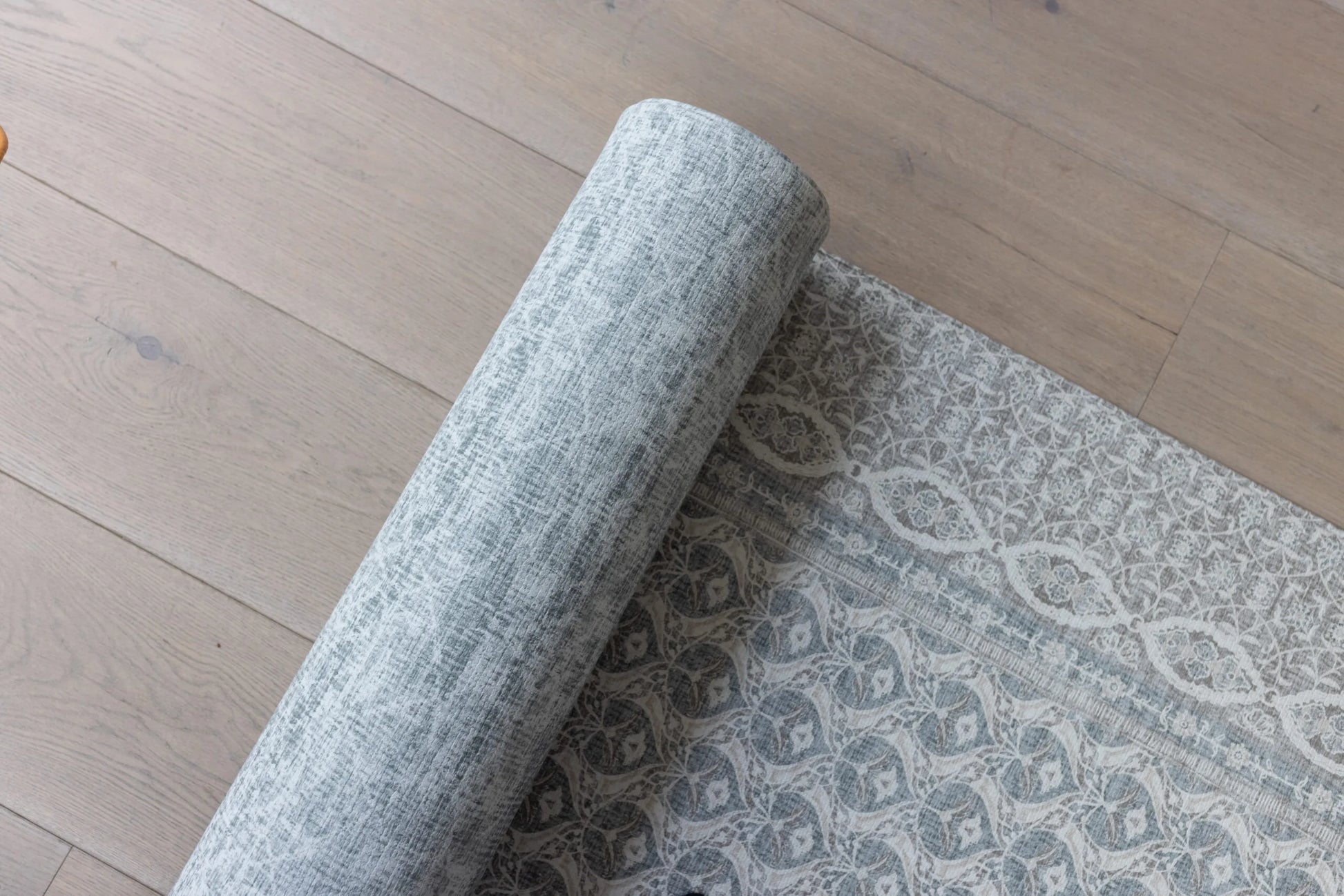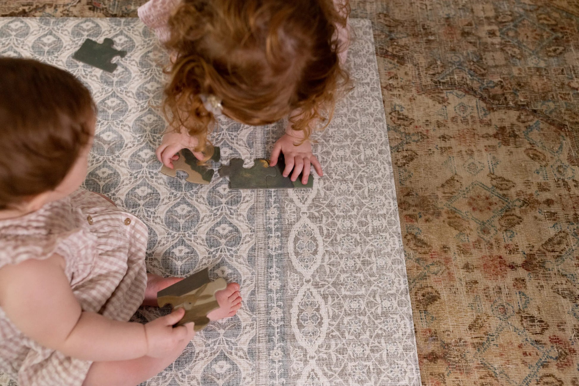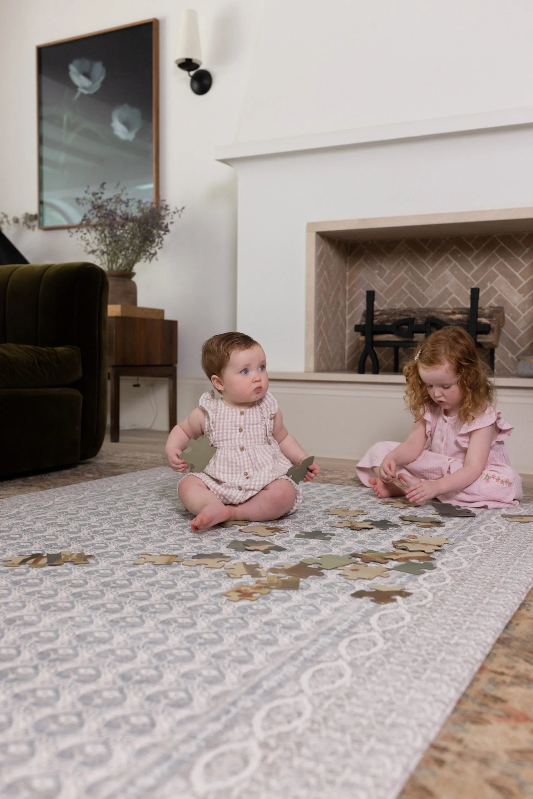 Antique-inspired in design + colour, tones of warm vintage grey, hazy blue + doilie blue enhance this rug-like playmat. // This traditional design has a heirloom aesthetic, designed in a fresh minimalist palette of duck egg + off-white.