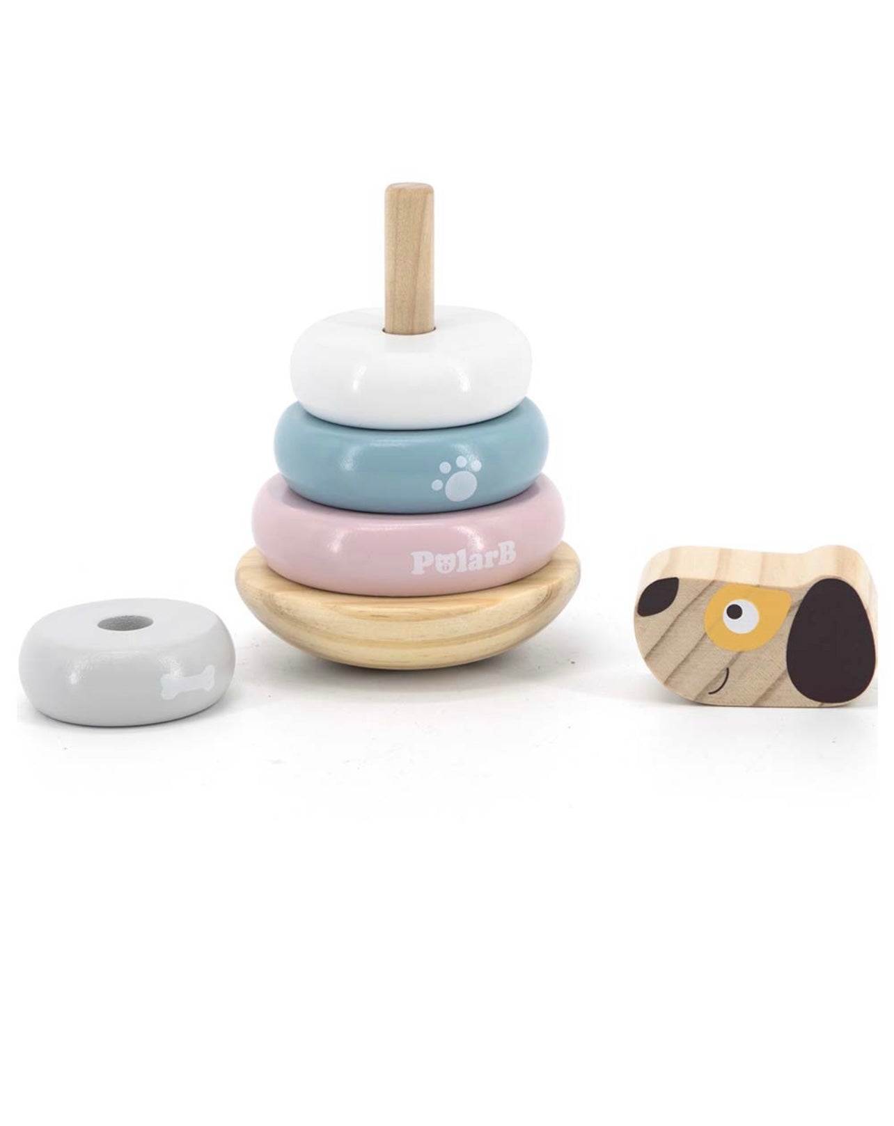 The Original Toy Company PolarB Wooden Polar Bear Stacker helps young children learn while playing. Not only will this polar bear's sweet expression make you and your little one smile, but this toy will encourage logical ability, hand-eye coordination, and imagination. Made from kid-safe materials with quality wood craftsmanship and non-toxic finishes. The rocking bottom adds even more fun. The size is 5.5" (14cm) tall, and the pastel coloured rings even have a polar bear footprint.